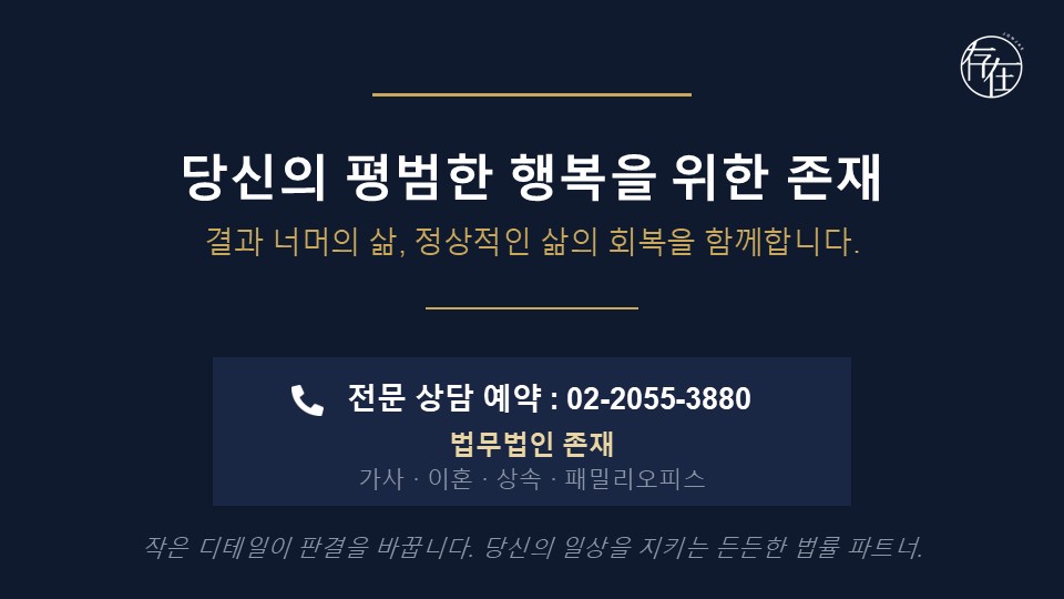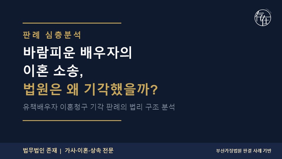 법무법인 존재는 최신 판례를 철저히 분석하여 의뢰인에게 가장 유리한 전략을 수립합니다. 오늘은 실무에서 반복적으로 등장하는 쟁점 — 유책배우자의 이혼 청구가 기각되는 구조를 부산가정법원-2018드단216724 판결 사례를 통해 전문가의 시각에서 풀어보겠습니다.