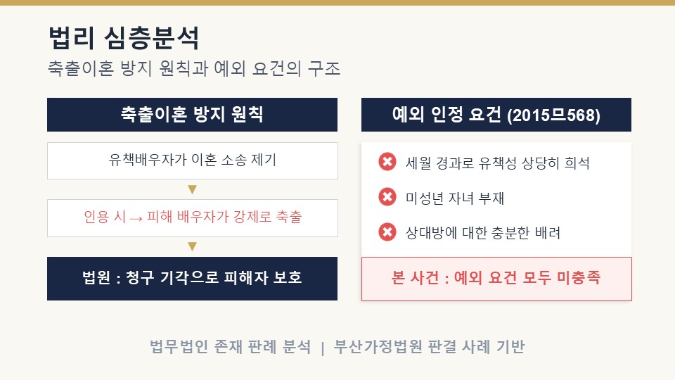 피고가 별도로 이혼 소송을 진행하고 있었다는 사정이 있었습니다. 그러나 법원은 이를 이혼 합의의 근거로 보지 않았습니다. 유책배우자의 청구를 그대로 인용하면 상대방이 자신의 의사와 무관하게 혼인 관계에서 쫓겨나는 결과, 이른바 ‘축출이혼’이 발생할 수 있기 때문입니다. 법원은 이를 엄격히 경계했습니다.