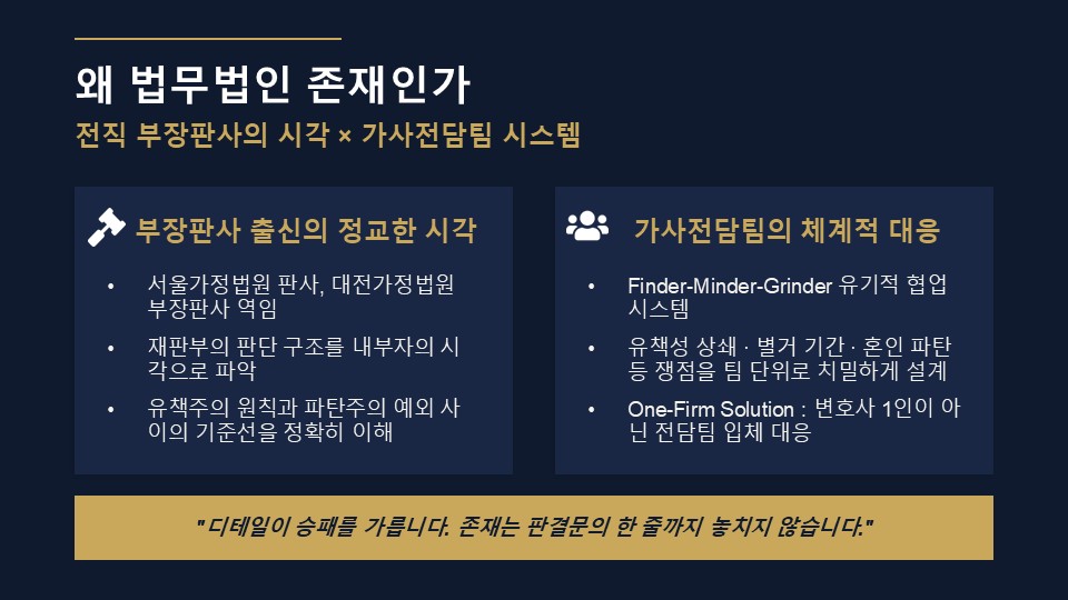 가사전담팀의 체계적 대응. 의뢰인이 처한 상황이 ‘유책성 상쇄’에 해당하는지, 상대방의 이혼 의사를 어떻게 입증할 것인지, 별거 기간과 혼인 파탄의 관계를 어떻게 구성할 것인지 — 이러한 쟁점을 팀 단위의 협업을 통해 치밀하게 설계합니다.