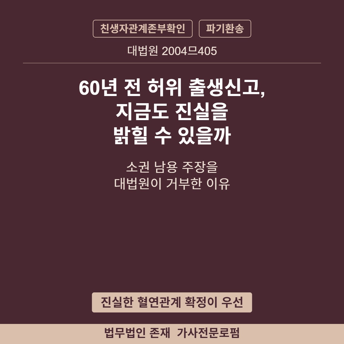 | 핵심 쟁점 | 50여 년간 유지된 허위 신분관계를 뒤늦게 다투는 것이 소권 남용인가 |